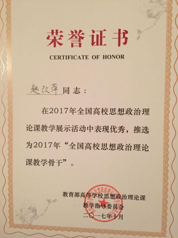 2017年10月27日至29日,由教育部高等学校思想政治理论课教学指导委员会主办的全国高校研究生“中国特色社会主义理论与实践研究”课现场教学展示活动在山东大学举行。sunbet申搏官方网站教师赵改萍代表山西省参加了现场教学展示,并荣获“全国高校思想政治理论课教学骨干”的荣誉称号。