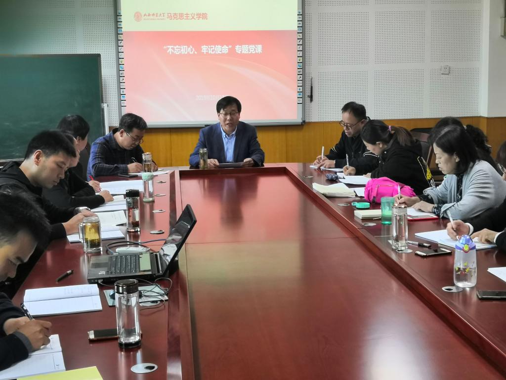 根据学校和sunbet申搏官方网站“不忘初心、牢记使命”主题教育工作安排,10月18日下午,sunbet申搏官方网站在科学会堂A508室举办了“不忘初心、牢记使命”主题教育专题党课。专题党课由院党委书记王银、院长贾绘泽分别主讲,全院教师和学生党员一同参加。