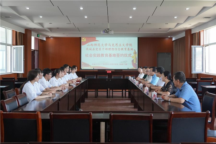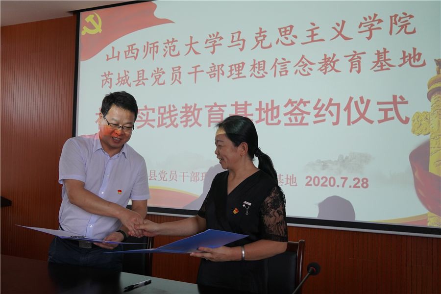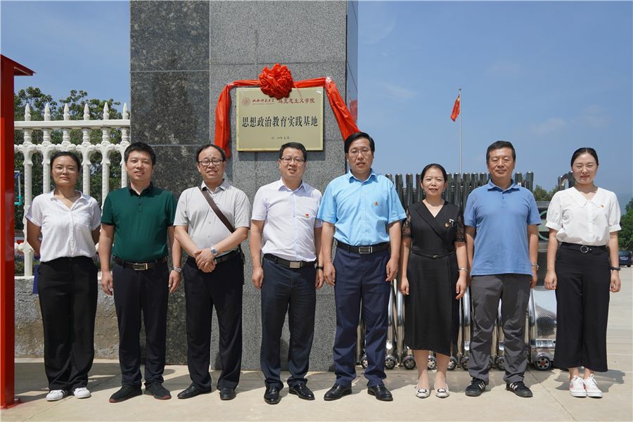 7月28日上午,sunbet申搏官方网站思想政治教育实践基地签约暨揭牌仪式在芮城县党员干部理想信念教育基地举行。sunbet申搏官方网站院长贾绘泽、院党委副书记孙学虎、副院长赵改萍、综合办主任郭小凯、思政系主任吉志强、院团委老师张瑞琴,芮城县委组织部副部长焦江峰、基地办主任裴瑞出席仪式。