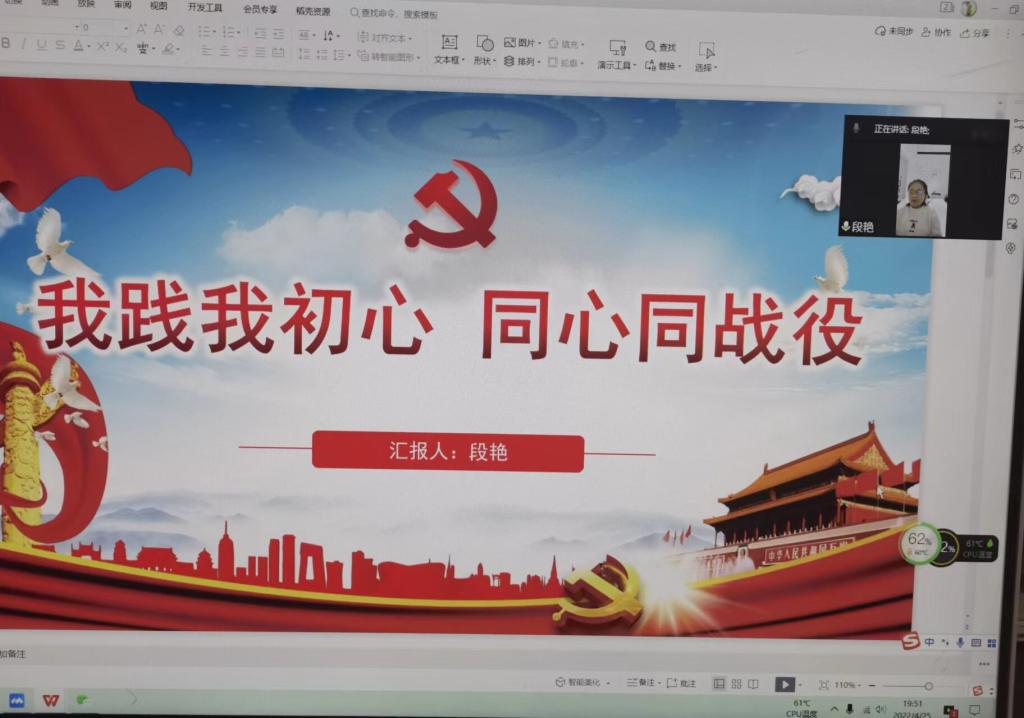 支部书记王艳首先传达校党委《关于在全校开展“我践我初心,同心同战疫”主题专项行动的通知》。随后,教工志愿者段艳同志、学生志愿者肖敏同志和高梦岩同志分别同大家介绍了自己在我校应急管控期志愿服务的经历,并从生活即教育、党旗在我心等方面分享了心得体会。