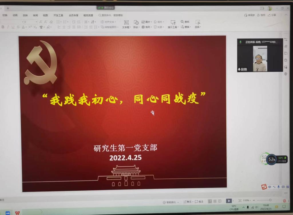 4月25日晚,sunbet申搏官方网站研究生第一党支部开展“我践我初心,同心同战疫”主题党日活动,红色引擎教工党支部段艳同志应邀参加了此次活动。