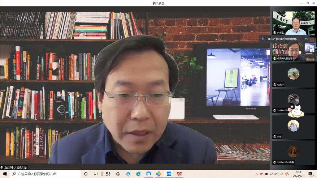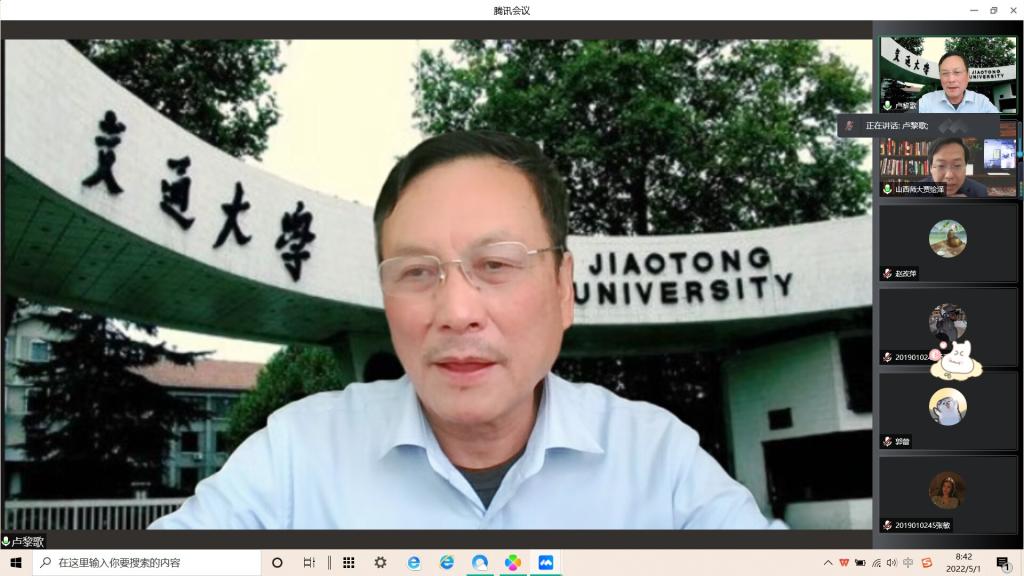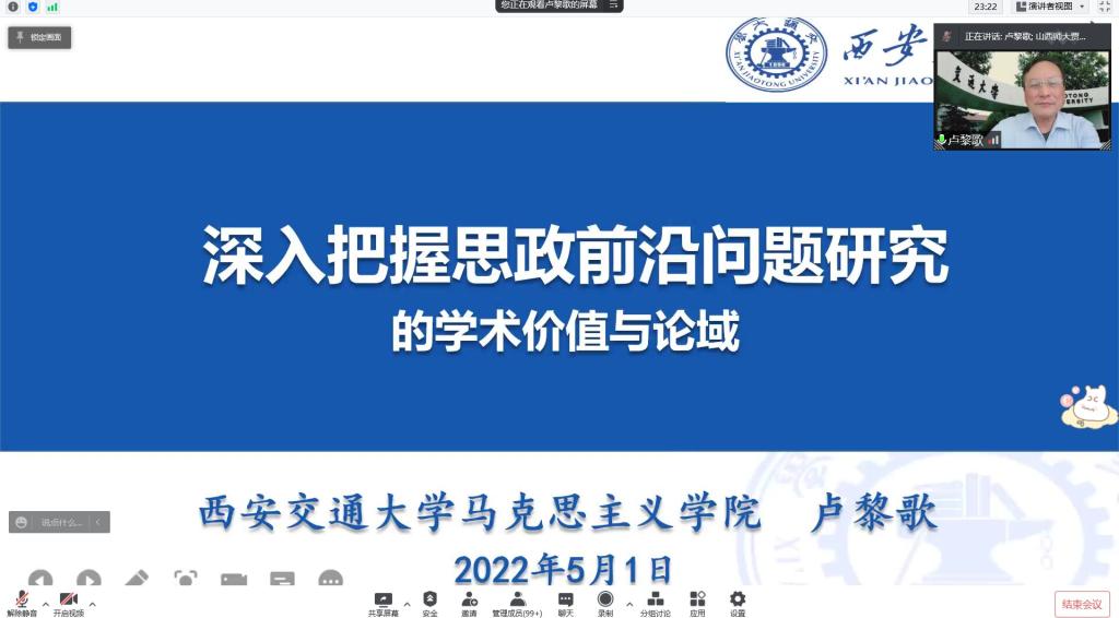 2022年5月1日上午,西安交通大学sunbet申搏官方网站卢黎歌教授应邀为sunbet申搏官方网站师生作题为“深入把握思政前沿问题研究的学术价值与论域”的学术报告。报告以腾讯会议形式举行,由校党委常委、副校长、sunbet申搏官方网站院长贾绘泽主持,sunbet申搏官方网站全体教师和各年级研究生、本科生约500余人参加。
