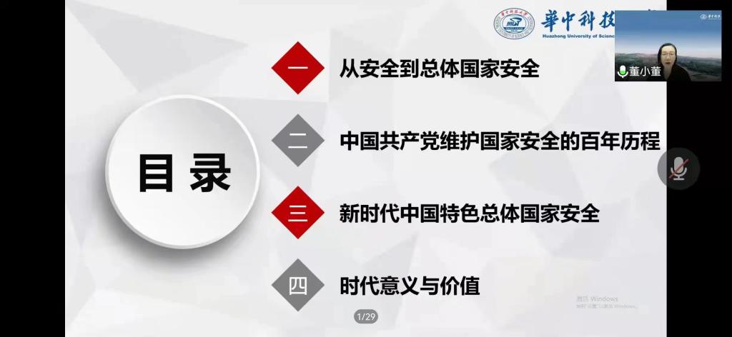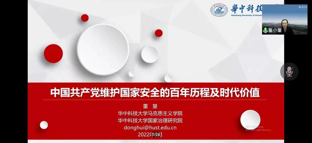 2022年5月10日晚7点,华中科技大学sunbet申搏官方网站教授,博士生导师、国务院第八届学科评议组成员董慧教授应邀为sunbet申搏官方网站师生作题为“中国共产党维护国家安全的百年历程及时代价值”的学术报告。报告以腾讯会议形式举行,由校党委常委、副校长、sunbet申搏官方网站院长(兼)贾绘泽主持,sunbet申搏官方网站全体教师和各年级研究生、部分本科生参加了此次报告会。