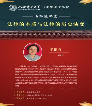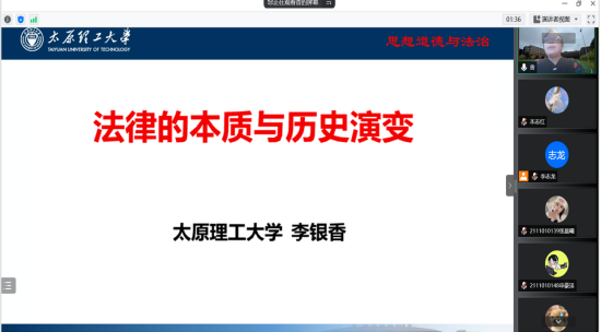 5月11日下午,太原理工大学、教育部思政课教学展示二等奖获得者李银香副教授走进《思想道德与法治》课堂,为我校100多名大一学生讲授《法律的本质与法律的历史演变》。李银香副教授运用问题链教学法,从做人的底线是什么?——法律的本质——法律的特征——法律的历史——你要做一个守法的人还是要做一个好人?等环环相扣的问题出发,联系实际,选取具体案例,使学生在潜移默化中接受理论的熏陶。