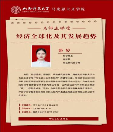 5月5日下午,太原科技大学、教育部思政课教学展示一等奖获得者骆婷副教授走进我校《马克思主义基本原理》课堂,为我校90多名大三学生讲授《经济全球化及其发展趋势》。骆婷副教授的授课从经济全球化的表现、经济全球化的形成与发展过程、经济全球化的影响、中国在经济全球化中扮演的角色四方面展开。骆老师以“学生身边”的丰富案例启发学生思考,用通俗易懂地语言阐释了抽象的原理,提升了学生学习思政理论知识的自我效能感,增强了所教授知识的亲近感、真实感、时代感。