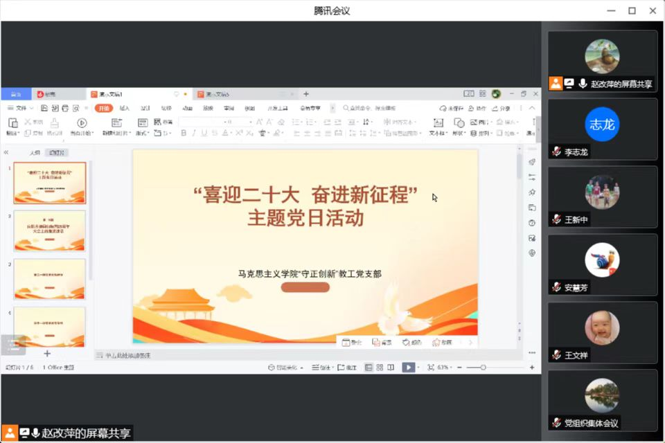 在中国共产党成立101周年之际,sunbet申搏官方网站“守正创新”教工党支部于2022年7月1日晚7点半在腾讯会议开展“喜迎二十大 奋进新征程”主题党日活动。此次主题党日活动由支部书记赵改萍主持,支部全体党员参加。支部联系校领导sunbet申搏官方网站纪委书记党志峰莅临指导。
