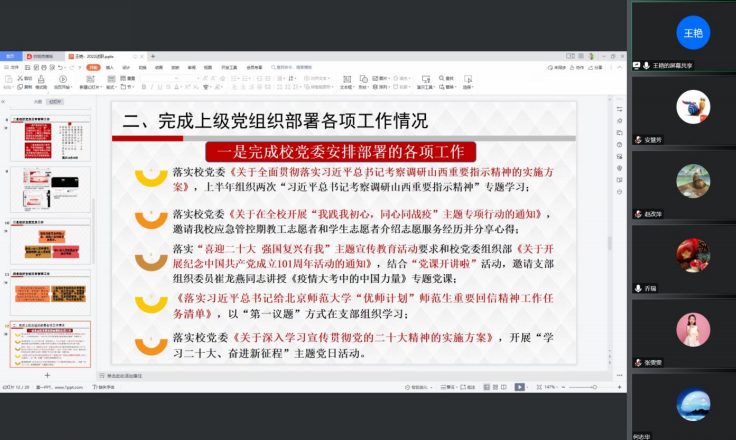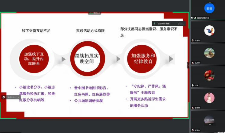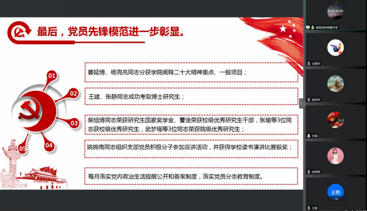 接着,“红色引擎”教工党支部书记、“守正创新”教工党支部书记、研究生第一党支部书记、研究生第二党支部书记、本科生党支部书记和专职组织员围绕完成岗位工作职责情况,完成上级党组织工作部署安排情况,发挥政治引领、规范组织生活和发挥主体作用等情况以及工作存在的突出问题及整改思路举措等情况,依次交流汇报。