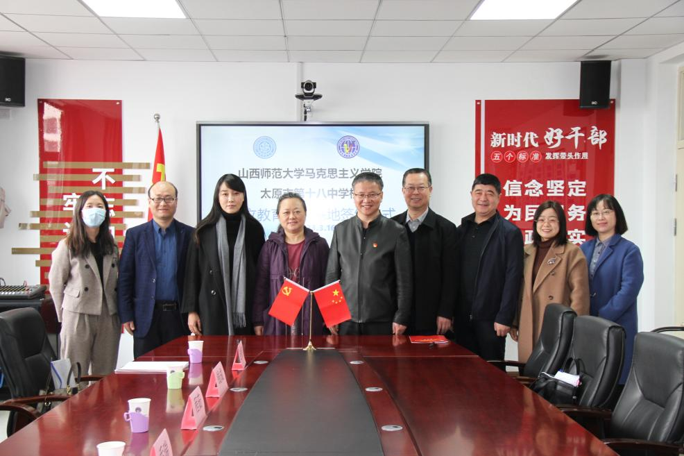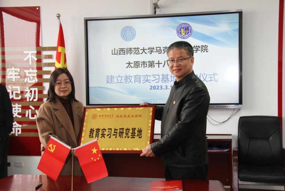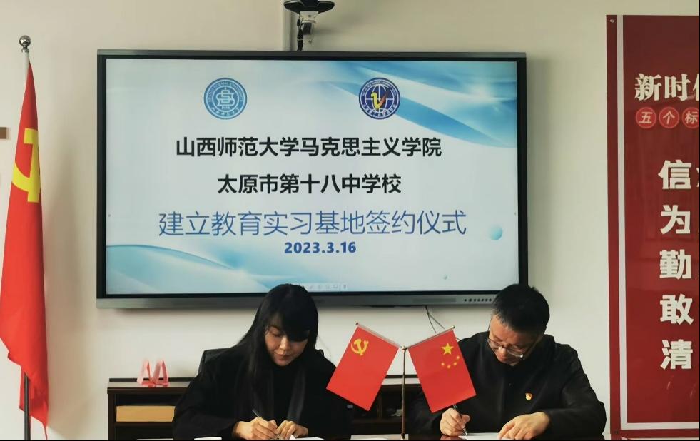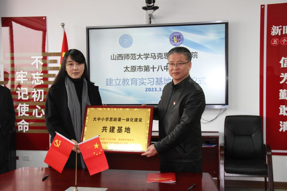 2023年3月16日上午,sunbet申搏官方网站与太原市第十八中学校大中小学思政课一体化合作共建基地、教育实习研究基地签约授牌仪式在太原市第十八中学校隆重举行。