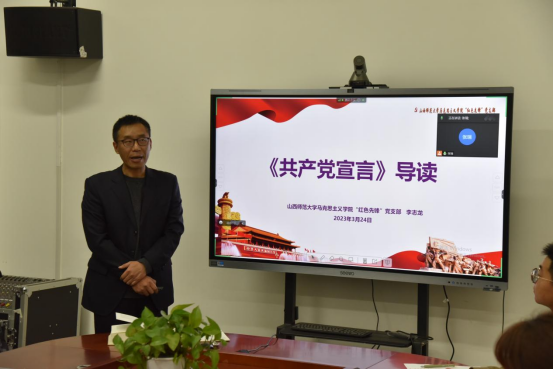 2023年3月24日晚上7点,sunbet申搏官方网站“红色先锋”党支部在南区1号楼506会议室开展马克思主义经典原著读书系列活动第四期,共同研读《共产党宣言》。此次活动由支部书记李志龙主持并领学,支部全体党员及入党积极分子以及“院青马工程”全部学员线上线下同时参加。