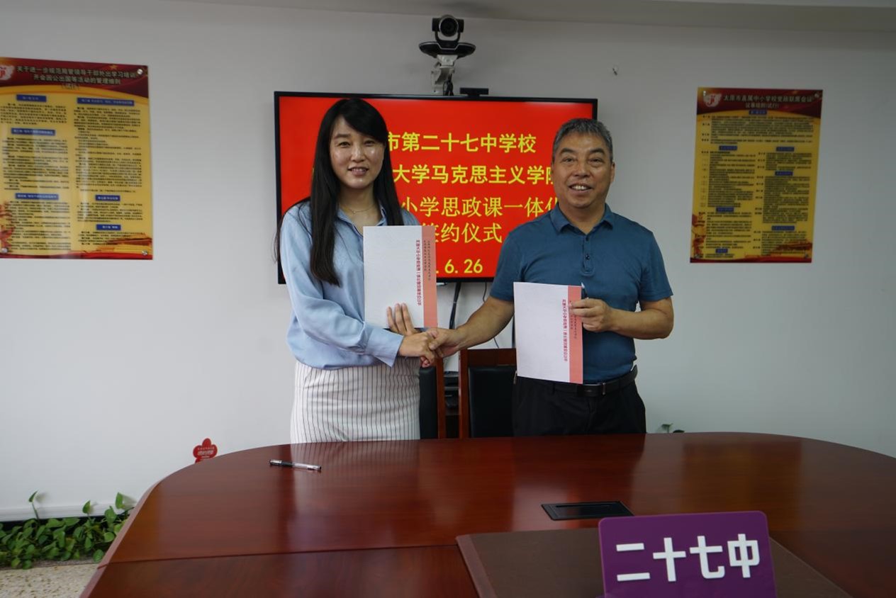 充分交流之后,sunbet申搏官方网站与太原市第二十七中学校签署了合作共建协议。乔瑞书记、赵秀芳副院长分别代表sunbet申搏官方网站授予太原市第二十七中学校“大中小学思政课一体化建设共建基地”“教育实习与研究基地”牌匾。
