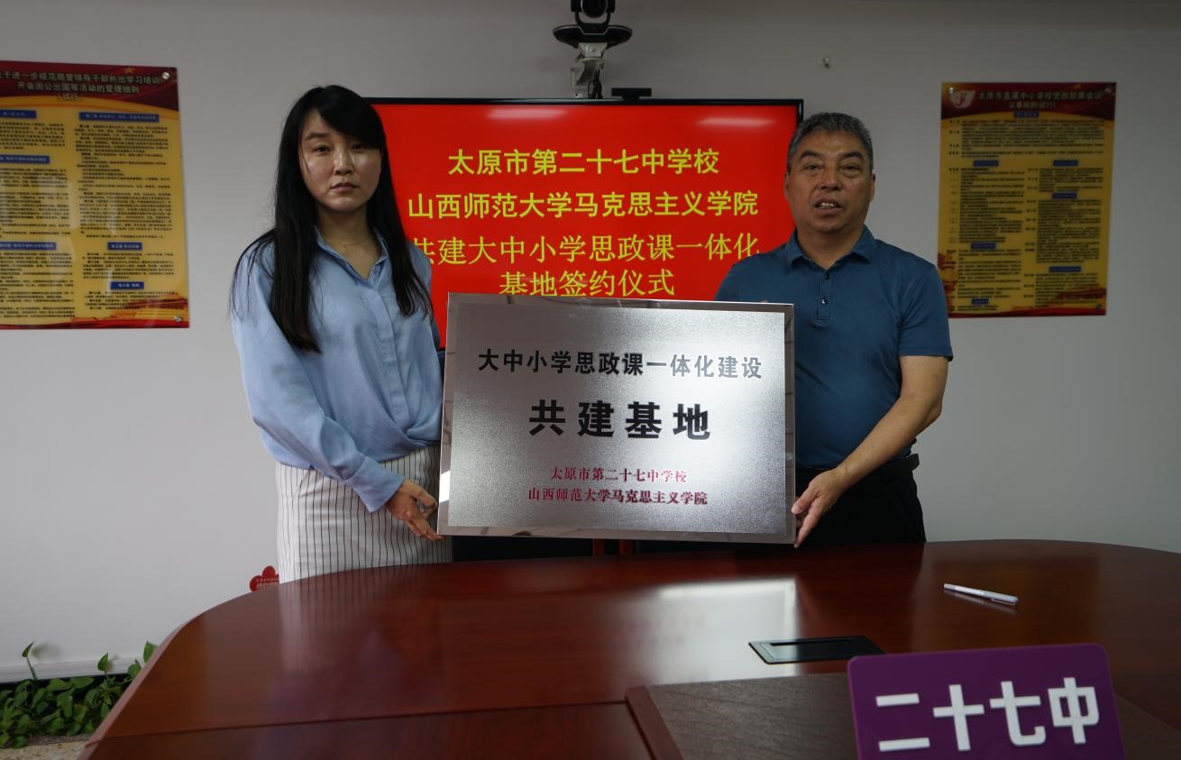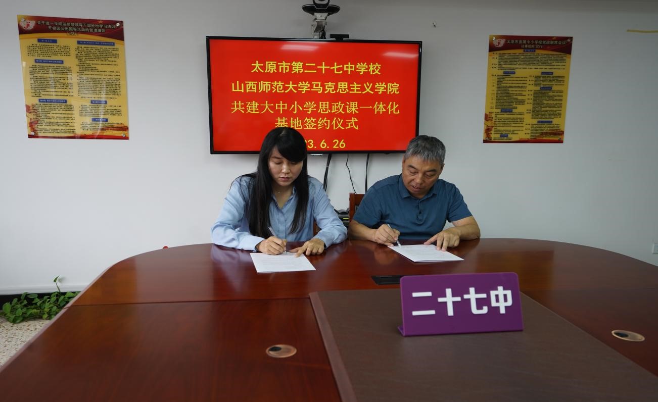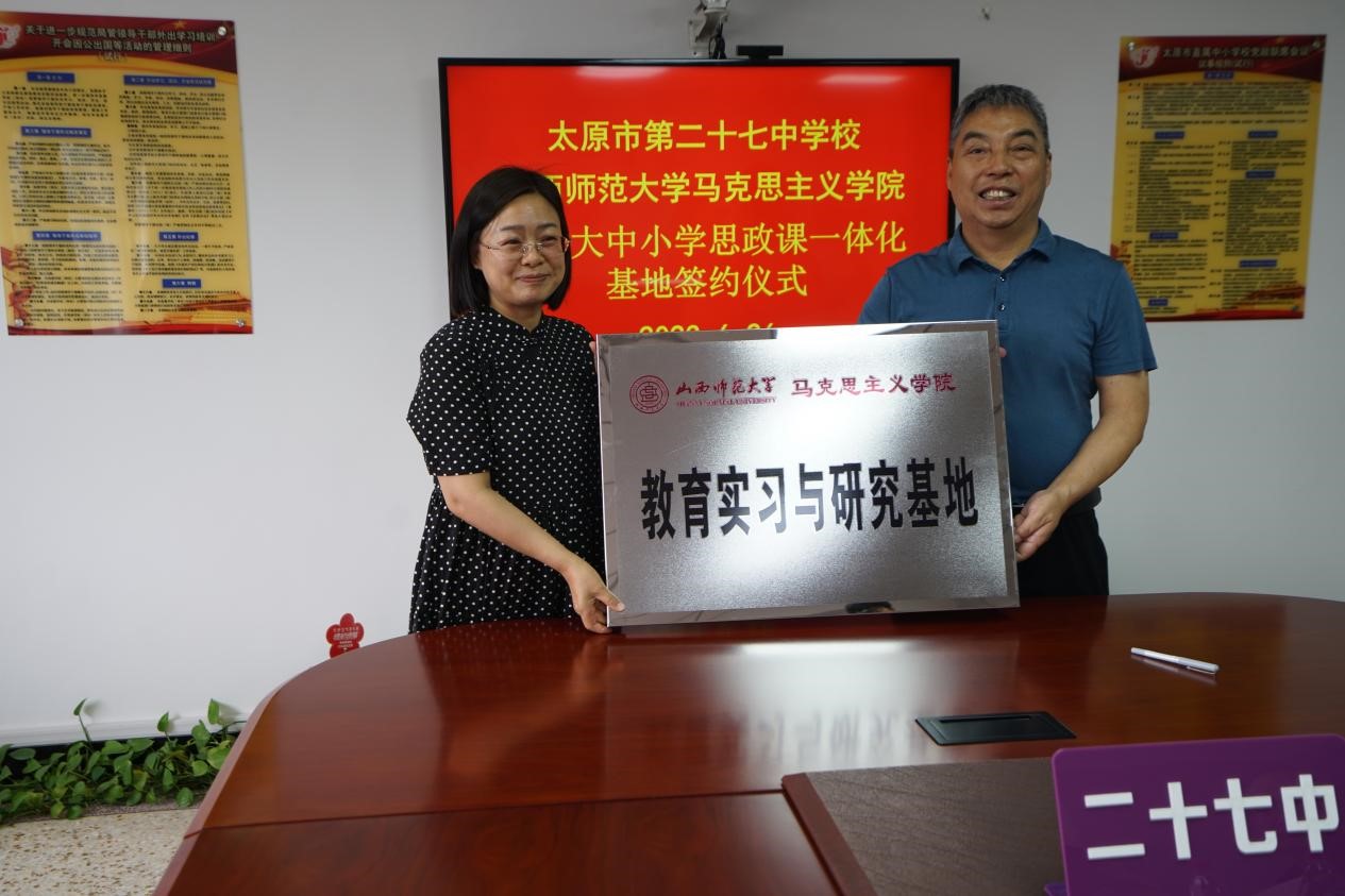 2023年6月26日上午,sunbet申搏官方网站与太原市第二十七中学校大中小学思政课一体化建设共建基地、教育实习与研究基地签约授牌仪式在太原市第二十七中学校隆重举行。