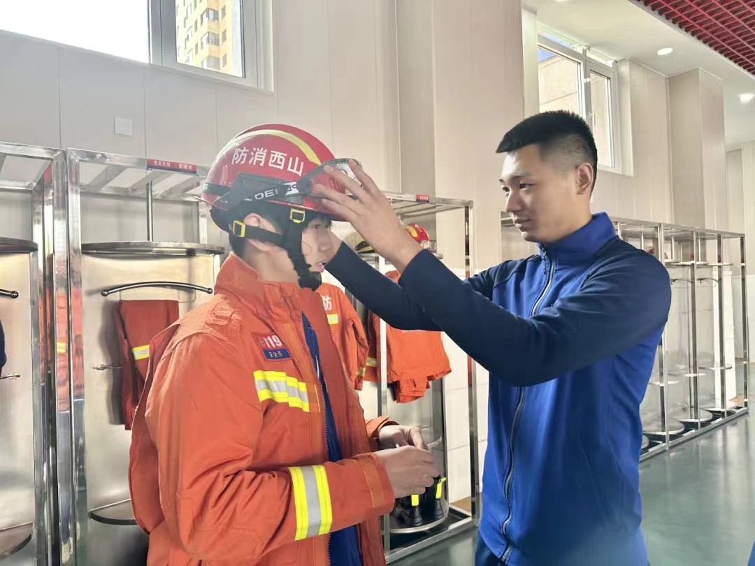 本次活动由消防员班长秦曜昕带领同学们参观。同学们首先走进消防楼内部,直上四楼,穿过消防大队的荣誉墙,走过他们的荣誉室,与他们火海中的峥嵘坚毅交换时空,习近平总书记寄语这些“蓝英雄”的十六字箴言铿锵有力,使人镌刻于心。跟随着秦班长的步伐,同学们又下楼依次参观了消防员的生活区和休闲俱乐部,同学们纷纷惊叹于他们方方正正、棱角分明的“豆腐块被子”,感受着他们严谨认真又不失趣味的生活气息。
