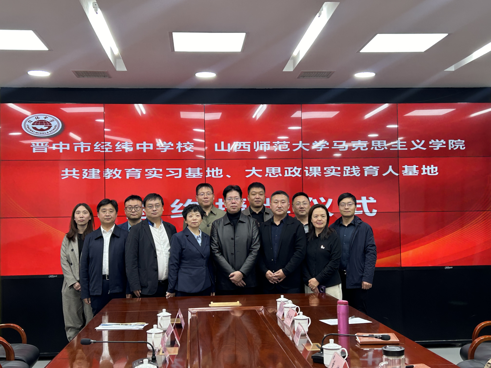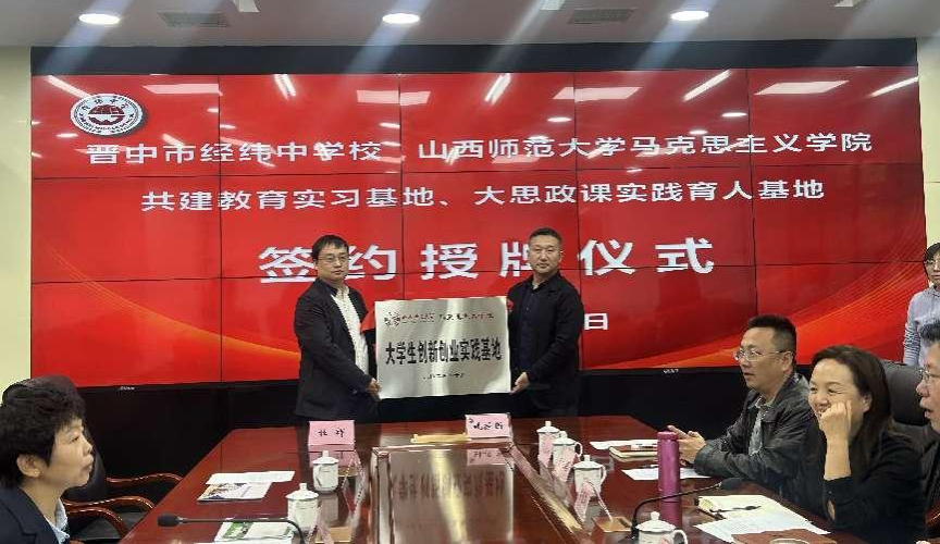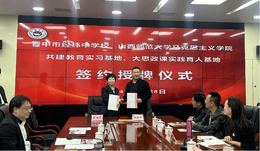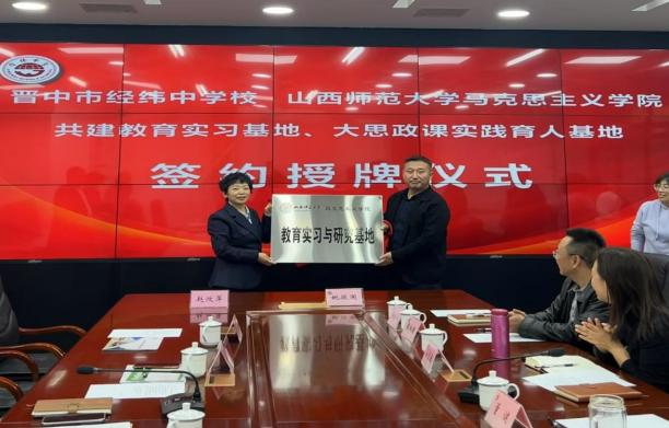 10月28日下午,sunbet申搏官方网站与晋中市经纬中学校共建教育实习与研究基地、大中小学思政课一体化建设基地、大学生创新创业实践基地签约授牌仪式在经纬中学校举行。仪式由经纬中学校副校长王宏主持,sunbet申搏官方网站常务副院长(正处级)赵改萍、党委副书记杜辉、副院长张昭、副院长杨海亮、思政系主任贾蕾以及经纬中学校领导班子参加。