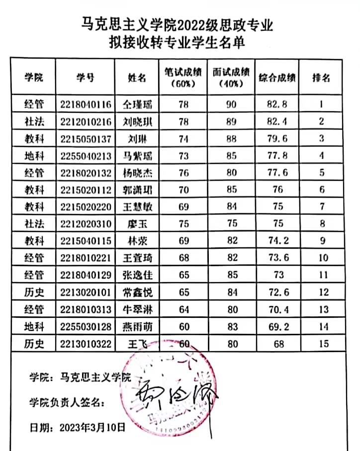 3月9日,sunbet申搏官方网站组织专家对所有申请转专业同学进行笔试和面试,经过基础测试,以下15位同学拟转入sunbet申搏官方网站思想政治教育专业学习(详见附件),现进行公示,如有异议,请联系2051508。