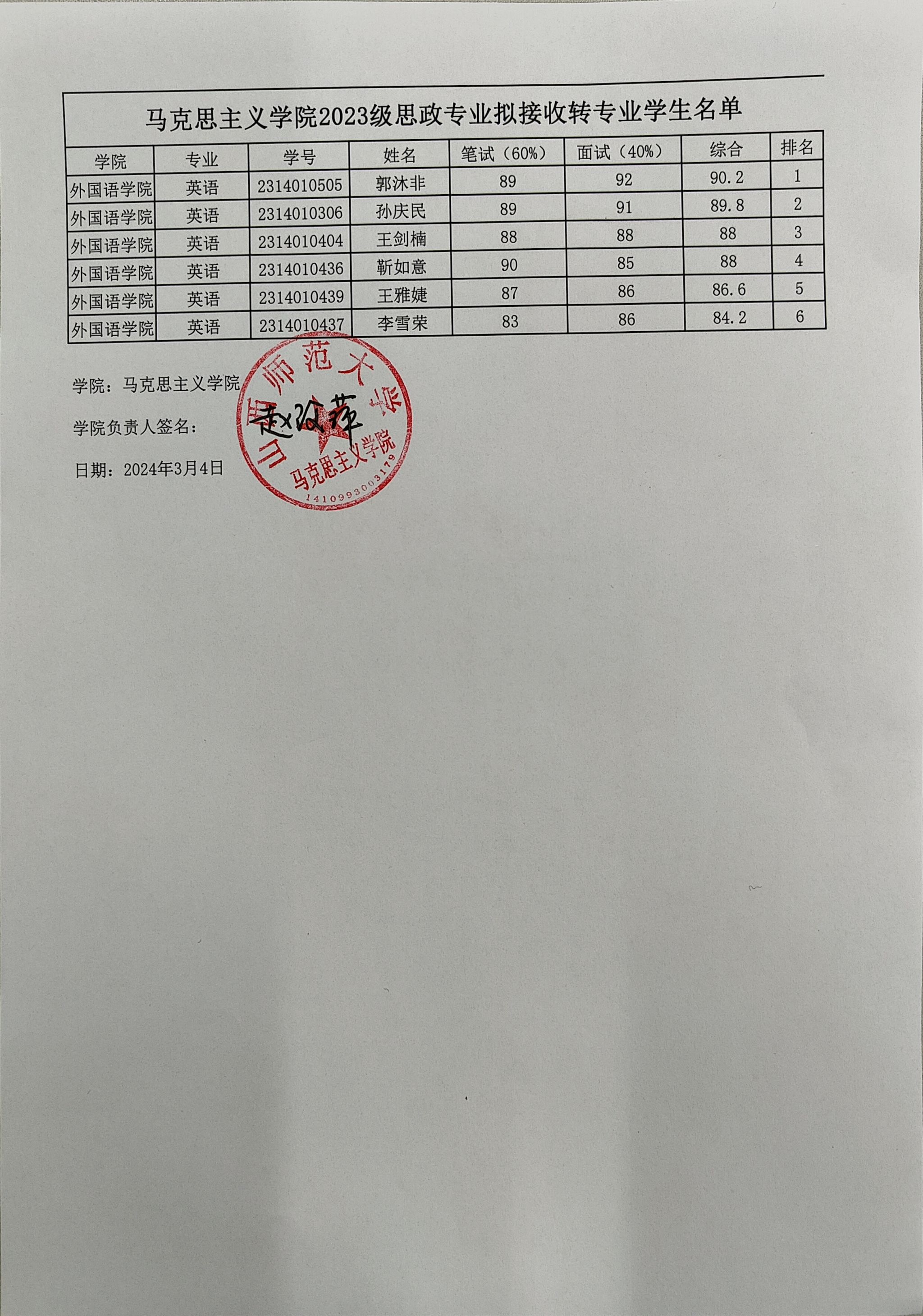 sunbet申搏官方网站2023级思政专业拟接收转专业学生名单
