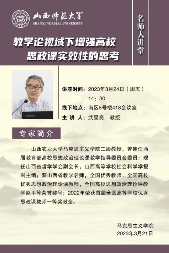 讲座预告|2023.3.24 武星亮 教授 教学论视域下增强高校思政课实效性的思考