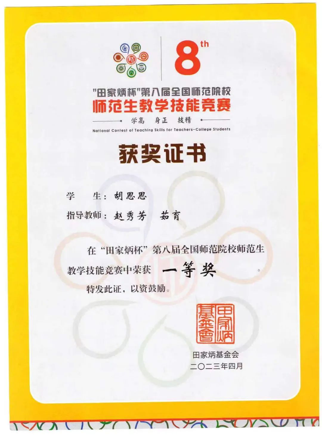 2023年4月15日至16日,“田家炳杯”第八届全国师范院校师范生教学技能竞赛决赛在浙江师范大学举行。sunbet申搏官方网站思想政治教育专业2020级学生胡思思(指导老师:赵秀芳、茹育)荣获一等奖。这是sunbet申搏官方网站在本科生培养工作中取得的突破性成绩。